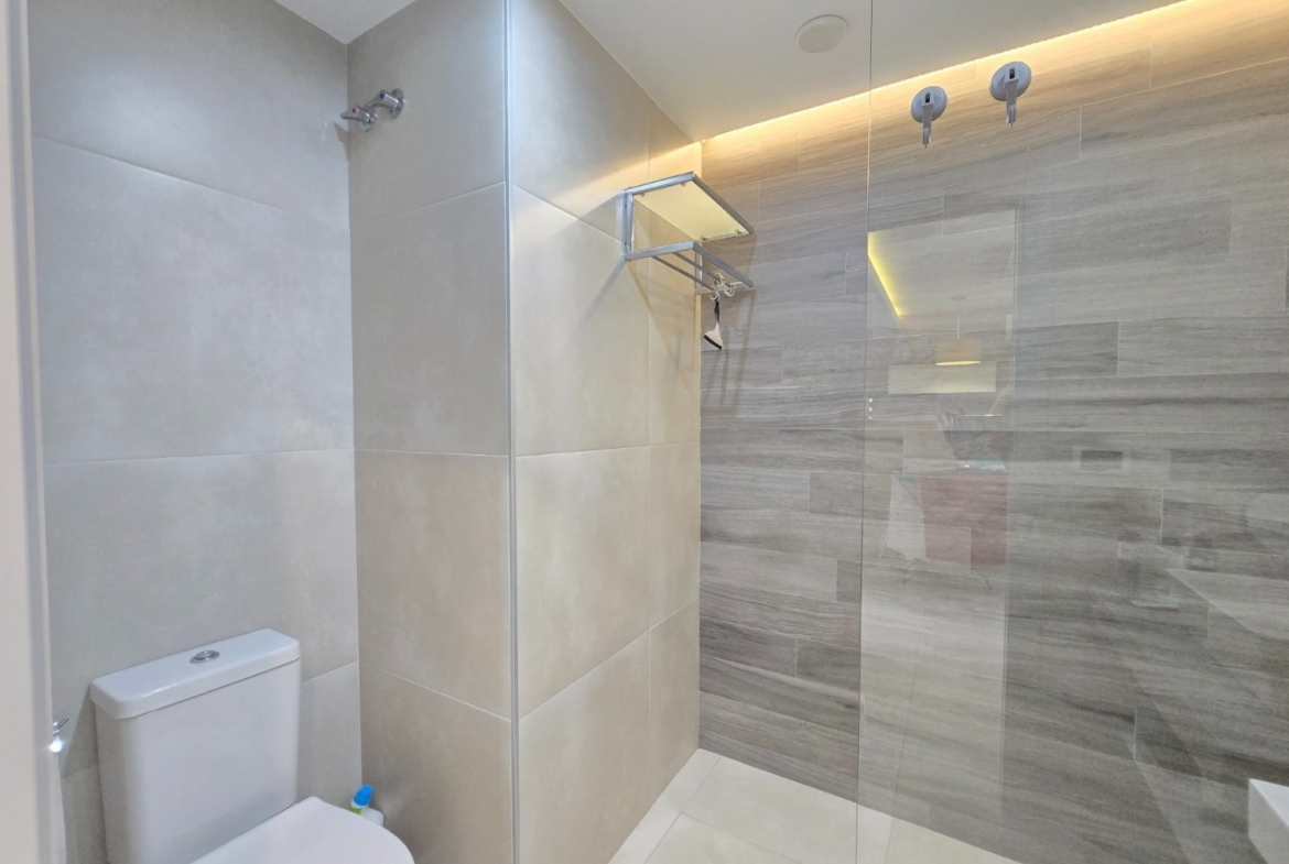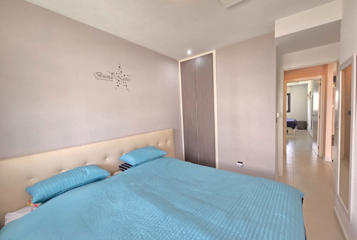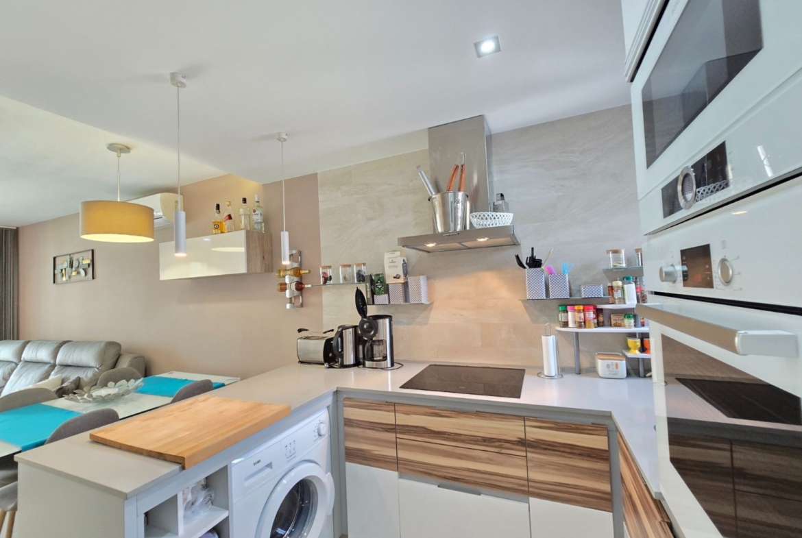 Apartament oferuje przestronny, jasny salon z otwartą, w pełni wyposażoną kuchnią, co tworzy nowoczesną i przyjazną przestrzeń dzienną. Dwie komfortowe sypialnie posiadają wbudowane szafy, a dwie nowoczesne łazienki zapewniają wygodę zarówno domownikom, jak i gościom.