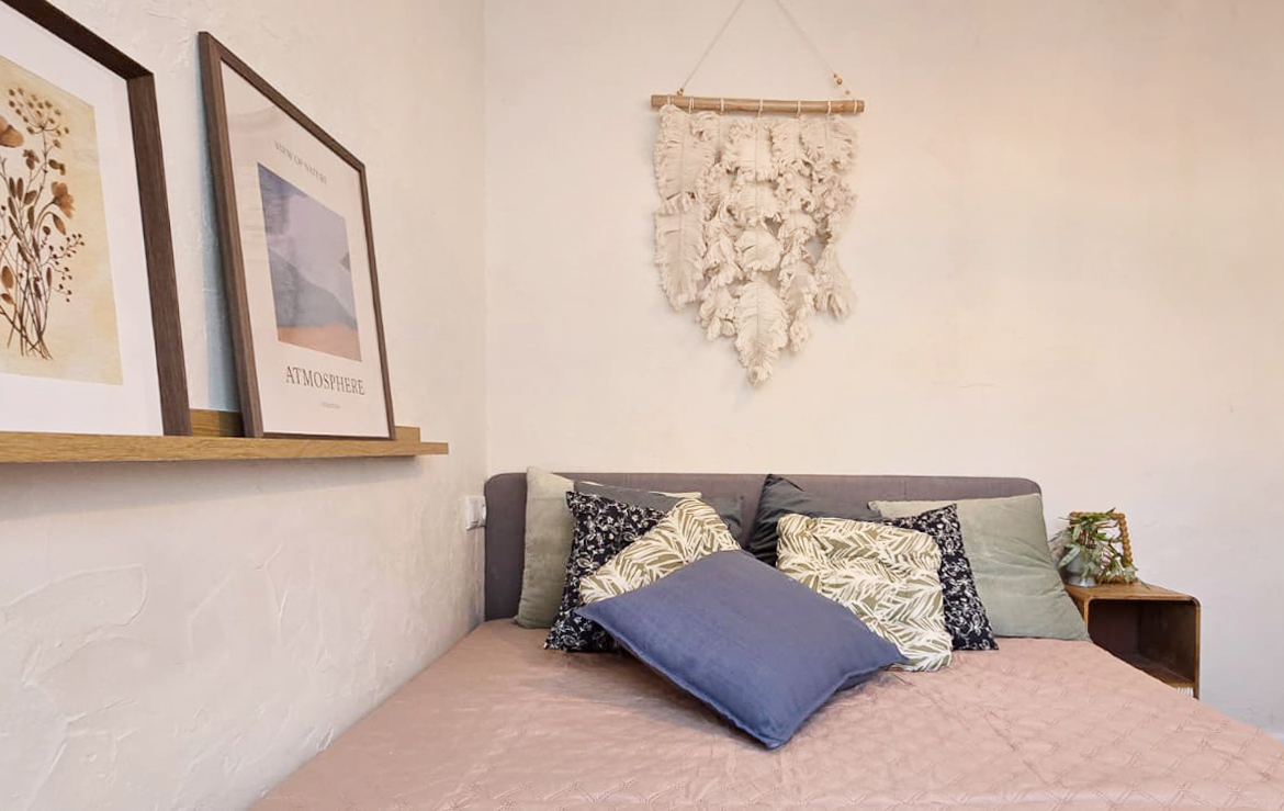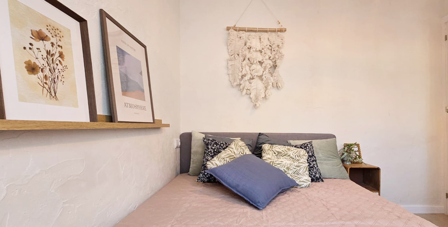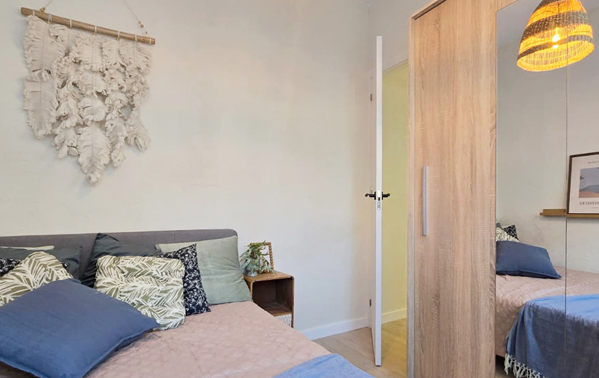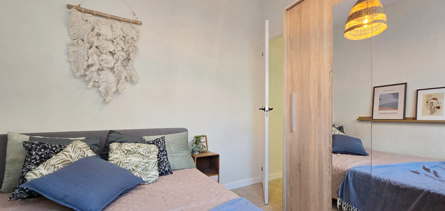 sypialnię z dużym łóżkiem i pojemną szafą,