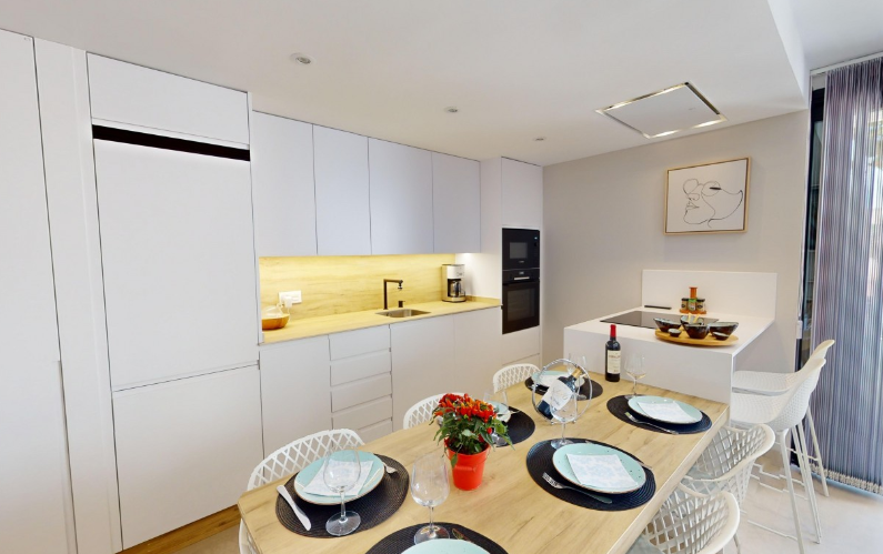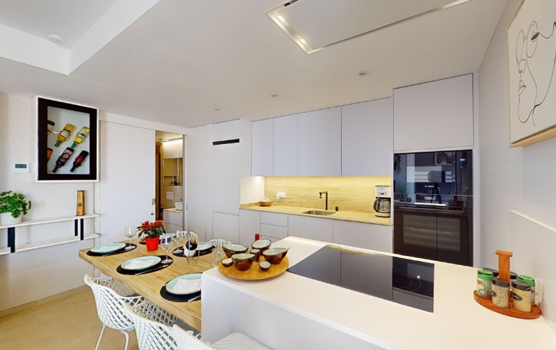 sprzęty wysokiej klasy (zmywarka, płyta, lodówka, piekarnik, mikrofalówka, okap, chłodziarka na wino)