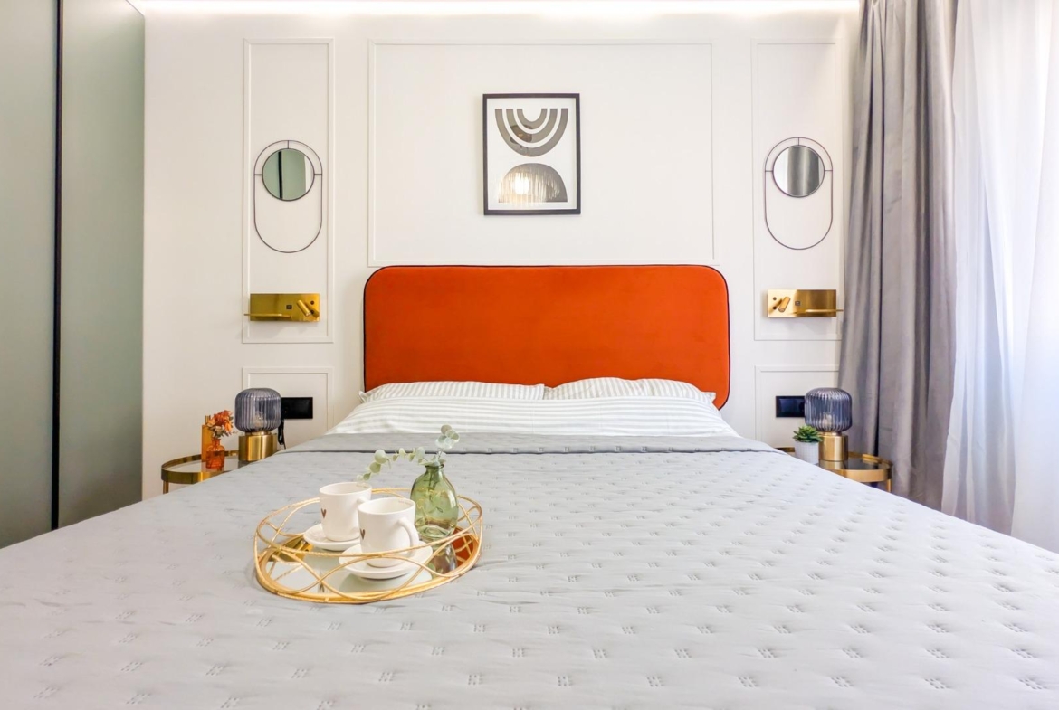 Apartament składa się z dwóch sypialni, eleganckiej łazienki oraz jasnego salonu z wyjściem na taras.