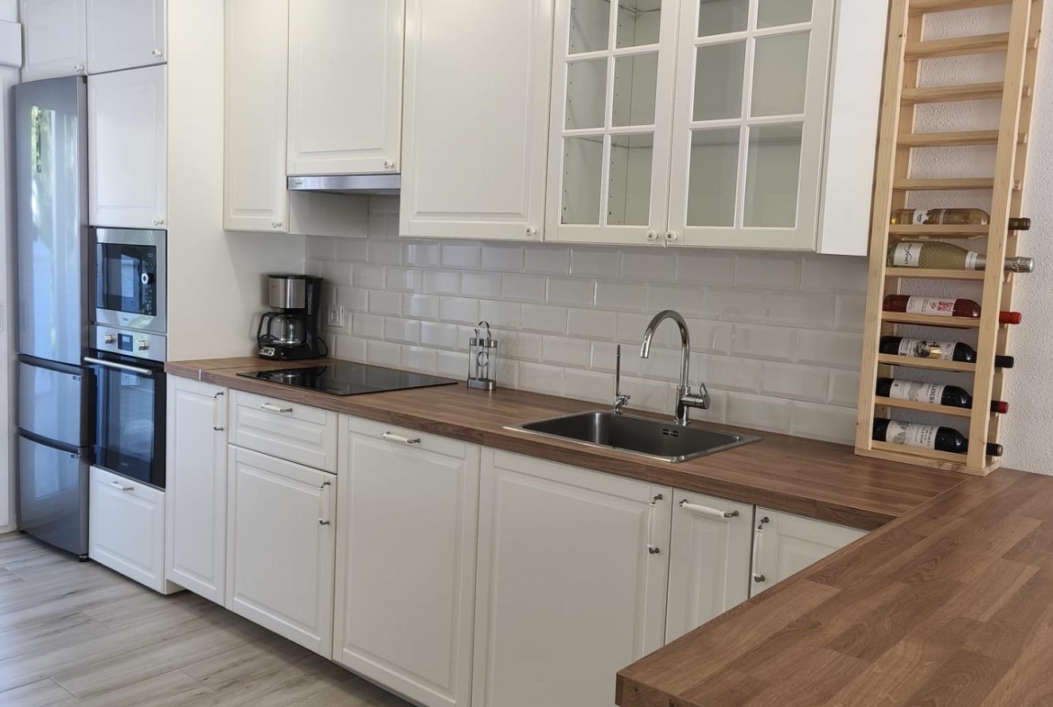 Nieruchomość o powierzchni 85 m² została całkowicie odnowiona z użyciem wysokiej klasy materiałów, dzięki czemu prezentuje się świeżo i stylowo. Na parterze znajduje się jasny salon połączony z w pełni wyposażoną kuchnią, tworząc funkcjonalną strefę dzienną. Znajdziemy tu również jedną z trzech sypialni oraz elegancko wykończoną łazienkę. Z salonu prowadzi wyjście na przestronny, około 30-metrowy taras — idealny do odpoczynku, grillowania lub spędzania czasu na świeżym powietrzu. Dodatkowym atutem jest patio wewnętrzne z praktycznym schowkiem.