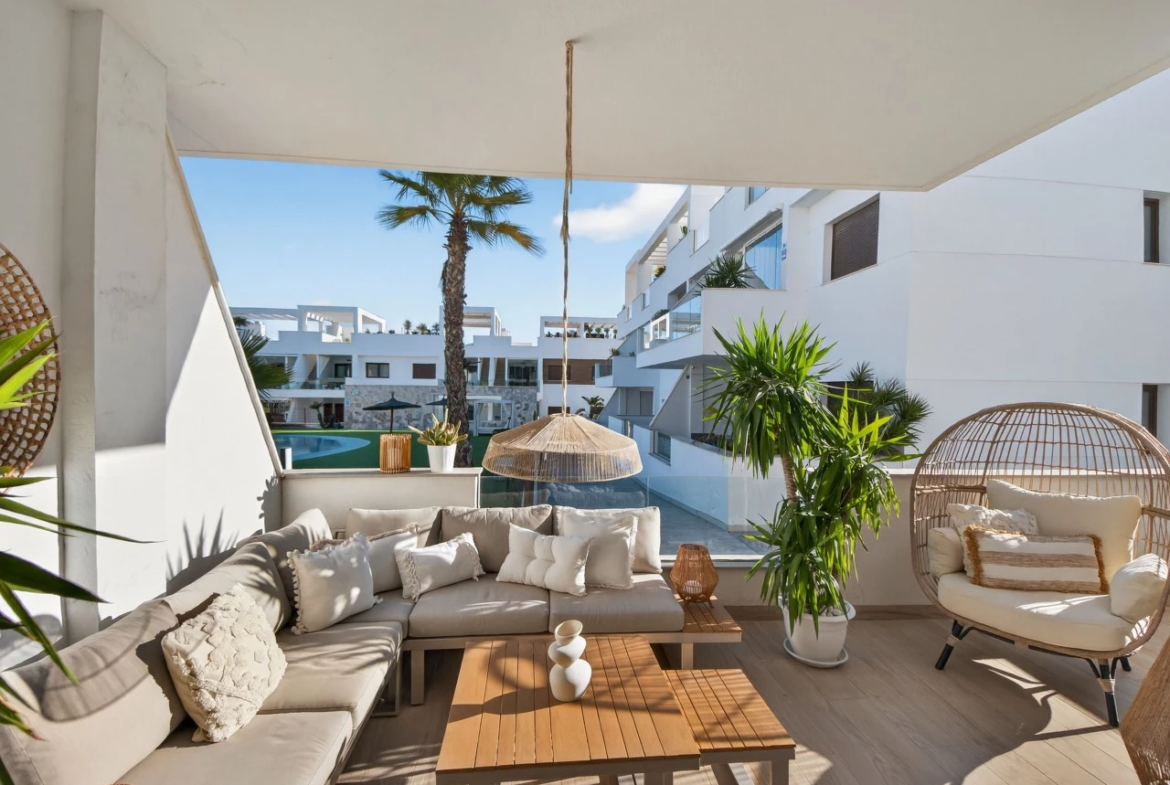 Już przy wejściu do apartamentu wita nas przestronny, słoneczny taras, idealny do wypoczynku na świeżym powietrzu i długich, spokojnych dni w hiszpańskim klimacie.
