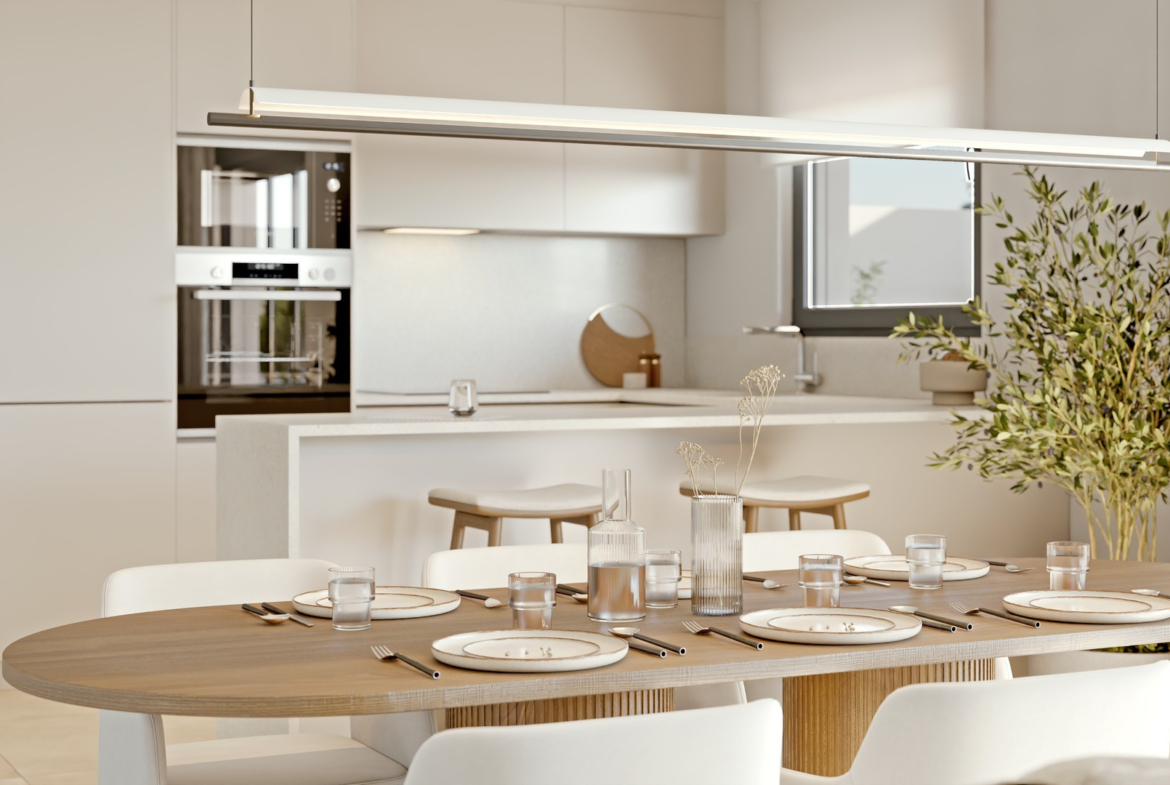 Apartamenty wyróżniają się otwartym układem wnętrz, łączącym salon, jadalnię i nowoczesną kuchnię. Duże przeszklenia oraz wysokie sufity zapewniają maksymalny dostęp naturalnego światła i poczucie przestronności.