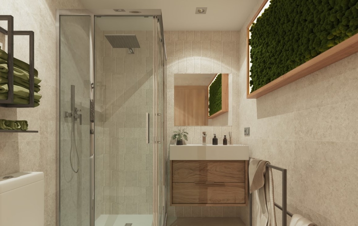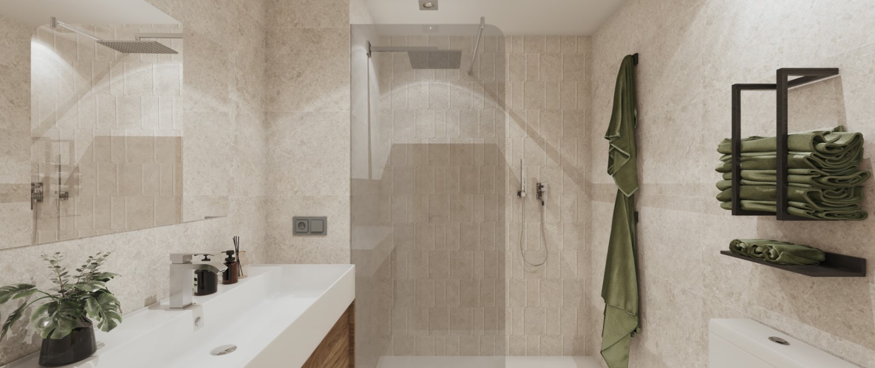 Fitted kitchens ze sprzętem AGD i w pełni wyposażone łazienki z kabiną prysznicową i lustrem.