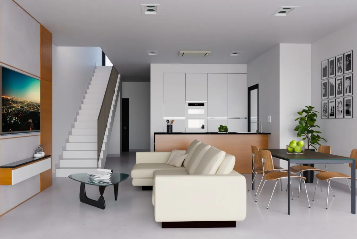 Jasny salon połączony z nowoczesną kuchnią w stylu open space