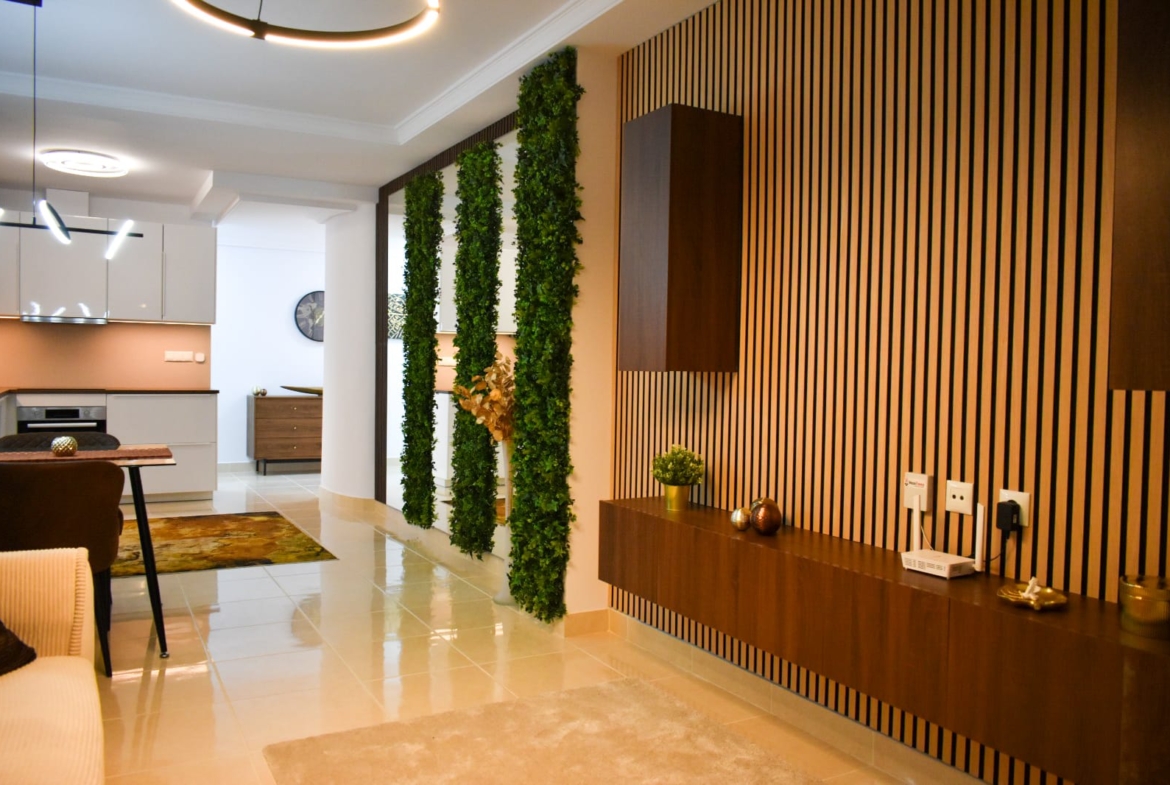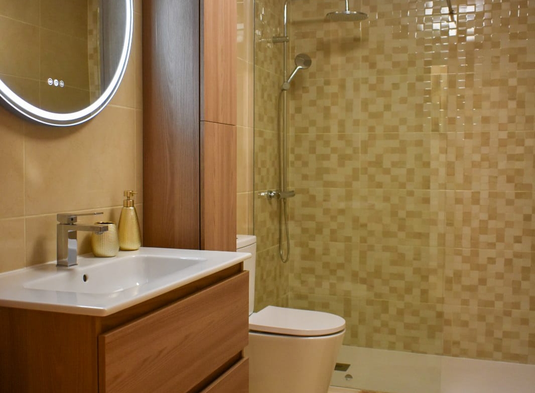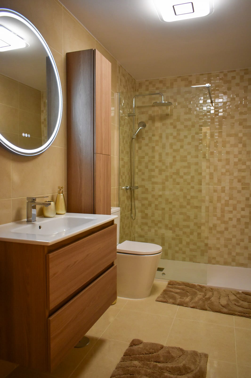 Apartament obejmuje dwie sypialnie oraz dwie eleganckie łazienki, z czego jedna przynależy bezpośrednio do sypialni głównej (en suite). Obie łazienki zostały urządzone w nowoczesnym stylu i wyposażone w przestronne prysznice typu walk-in. Dodatkowym atutem mieszkania jest wewnętrzne patio, idealne jako dodatkowa przestrzeń gospodarcza.