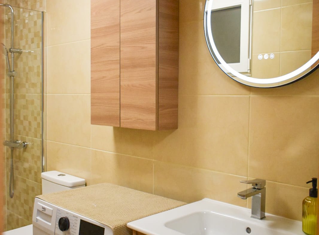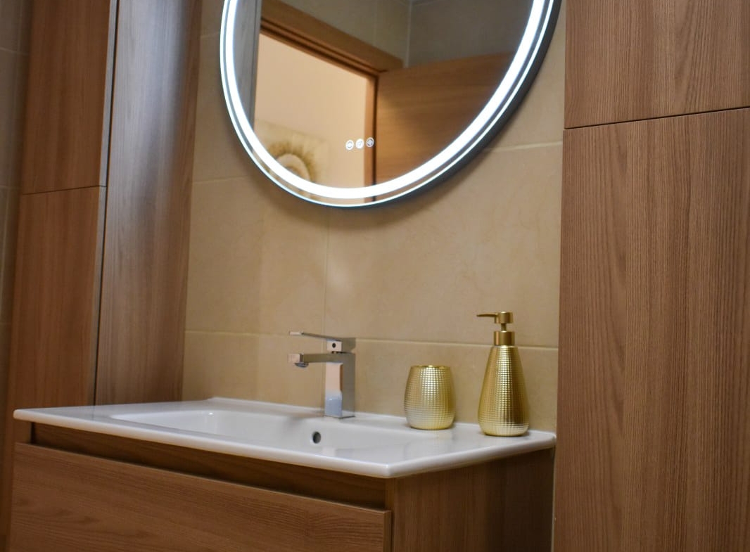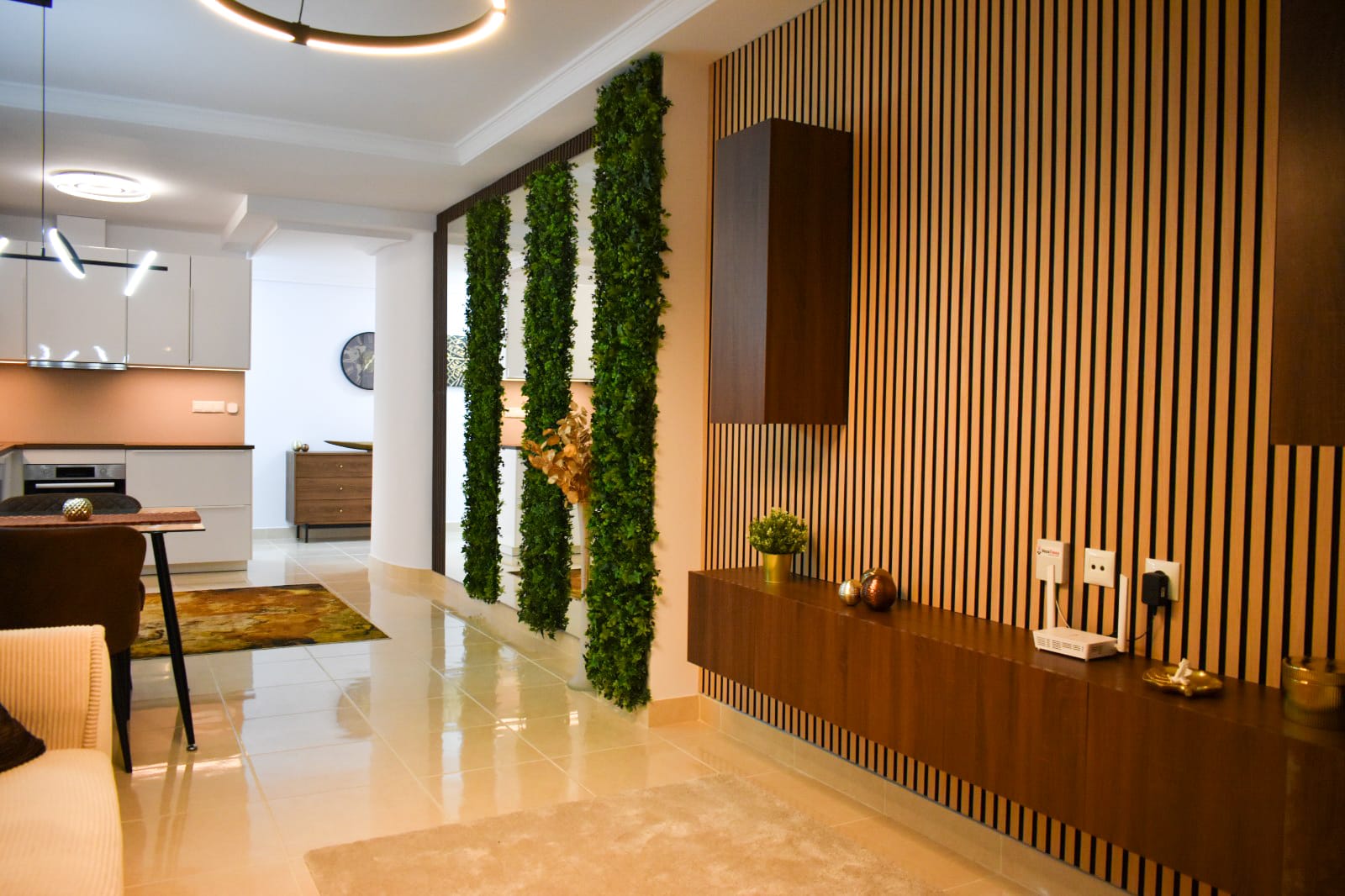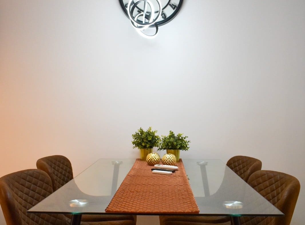Apartament obejmuje dwie sypialnie oraz dwie eleganckie łazienki, z czego jedna przynależy bezpośrednio do sypialni głównej (en suite). Obie łazienki zostały urządzone w nowoczesnym stylu i wyposażone w przestronne prysznice typu walk-in. Dodatkowym atutem mieszkania jest wewnętrzne patio, idealne jako dodatkowa przestrzeń gospodarcza.
