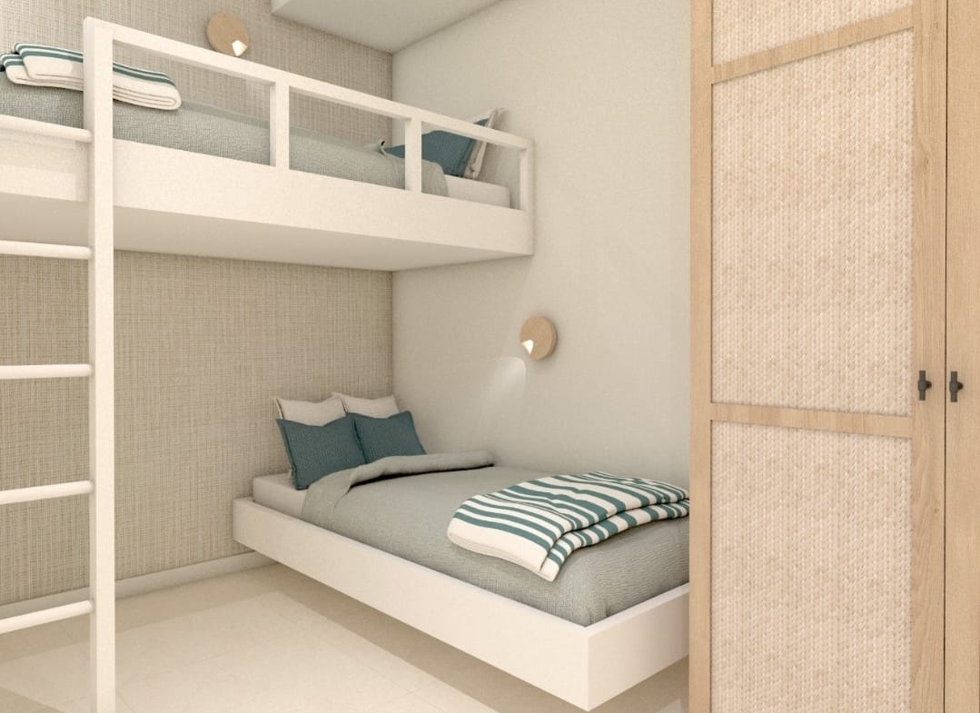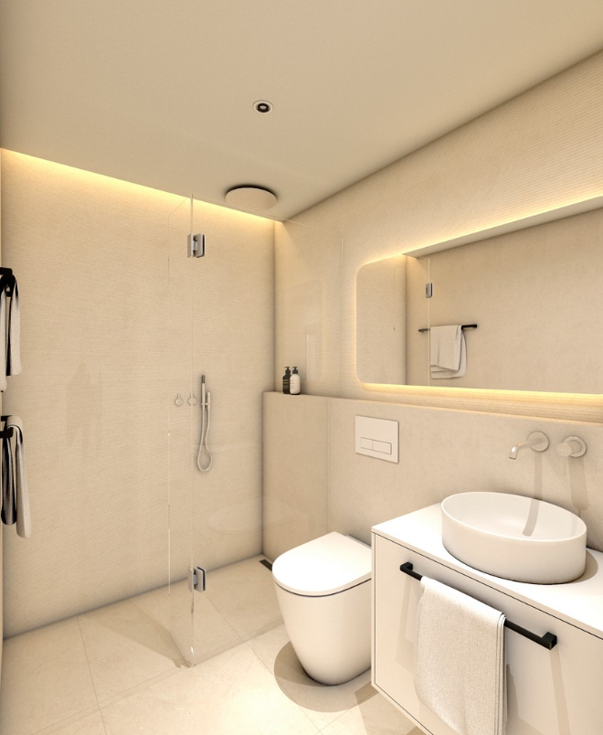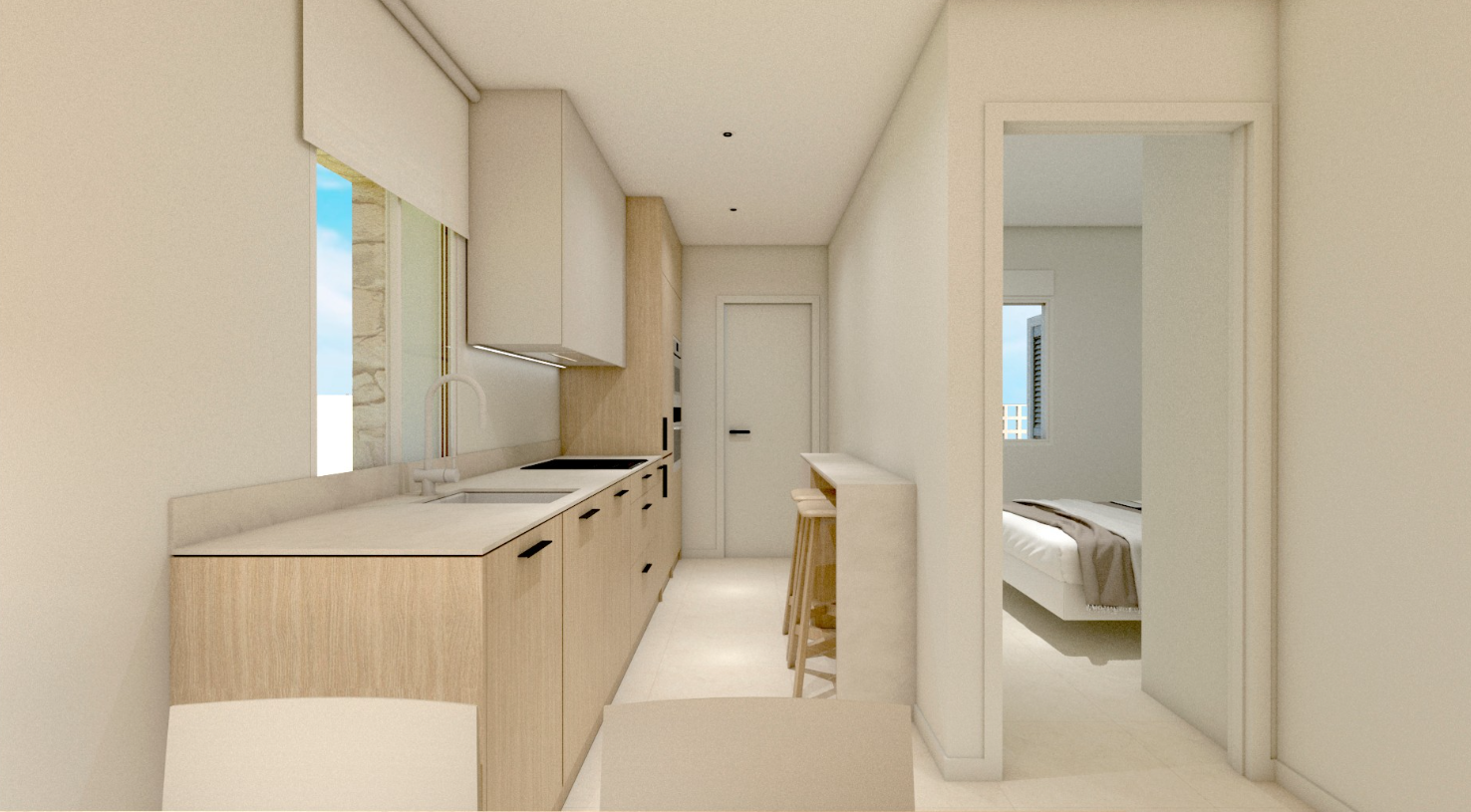 Wszystkie apartamenty posiadają jasny salon z aneksem kuchennym, trzy przestronne sypialnie z wbudowanymi szafami oraz dwie łazienki, z których jedna przylega do sypialni głównej. Salon i sypialnia zapewniają bezpośrednie wyjście na taras.