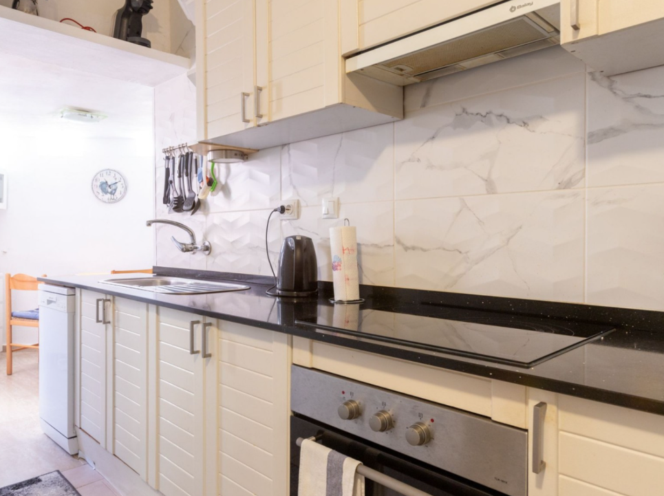 Na parterze znajduje się toaleta dla gości, oddzielna kuchnia, jadalnia oraz jasny salon z bezpośrednim wyjściem na słoneczny taras od strony południowej. Na piętrze mieszczą się dwie sypialnie z wbudowanymi szafami oraz łazienka z prysznicem – główna sypialnia posiada dodatkowo własny balkon, który podkreśla jasny i przytulny charakter wnętrza. Niewątpliwym atutem nieruchomości jest prywatny taras na dachu (solarium), z którego rozpościera się piękny widok na morze i wspólny teren z bujną roślinnością oraz basenem.