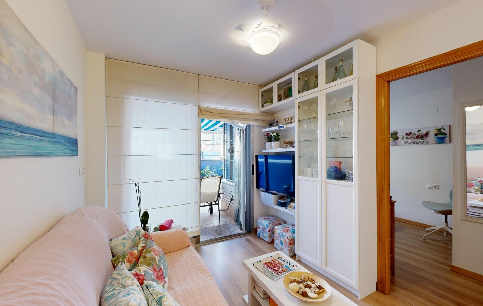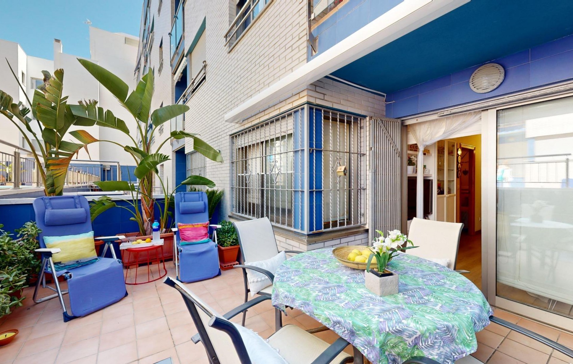 Jednym z największych atutów nieruchomości jest przestronny taras z bezpośrednim wyjściem na teren basenu, idealny do odpoczynku przy porannej kawie lub wieczornym kieliszku wina. Na tarasie znajduje się także praktyczna markiza. W mieszkaniu zainstalowano centralną klimatyzację oraz wentylatory sufitowe we wszystkich pomieszczeniach, co zapewnia komfort przez cały rok.