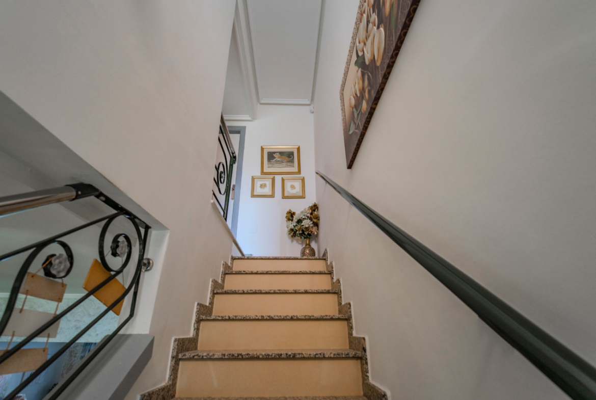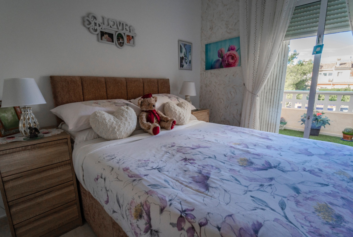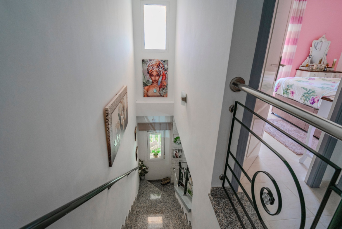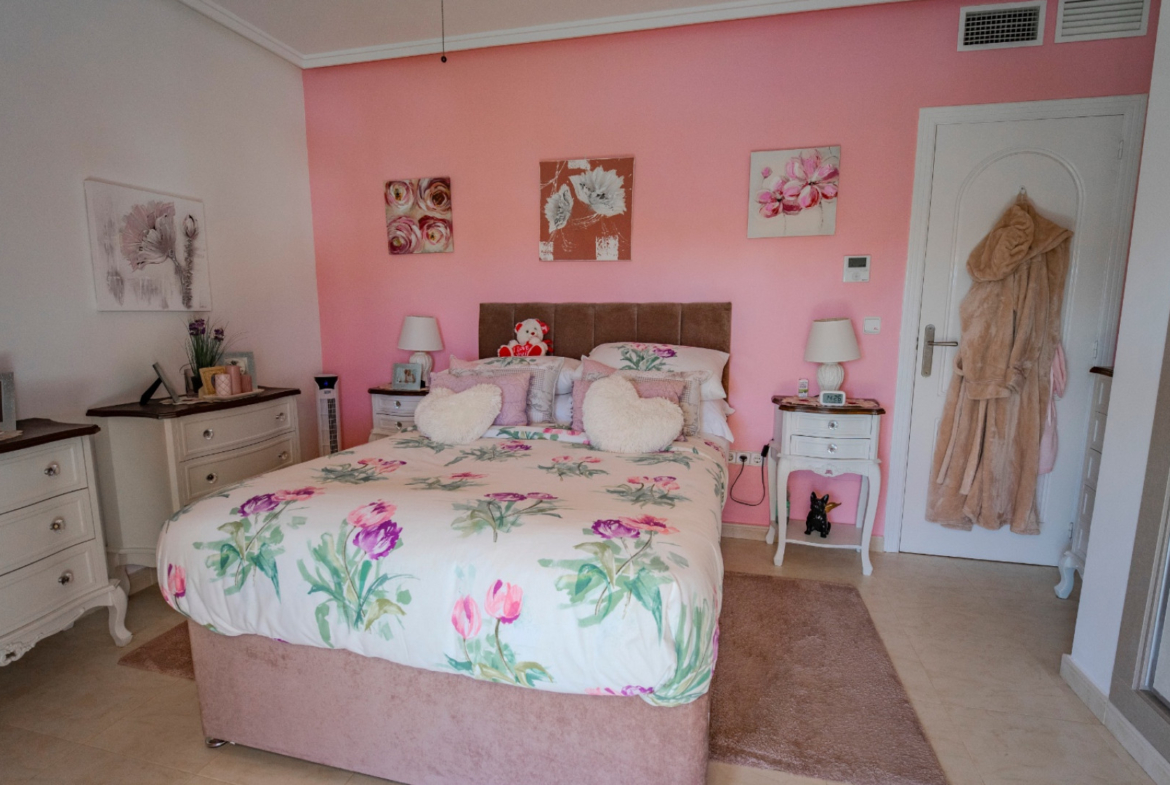 Na piętrze znajdują się dwie komfortowe sypialnie, obie z dostępem do prywatnych balkonów, z czego główna sypialnia oferuje przyjemny widok na basen. W całym domu zainstalowano kanałową klimatyzację, a także elektryczne markizy. Nieruchomość sprzedawana jest w pełni umeblowana, gotowa do zamieszkania bez dodatkowych nakładów finansowych.