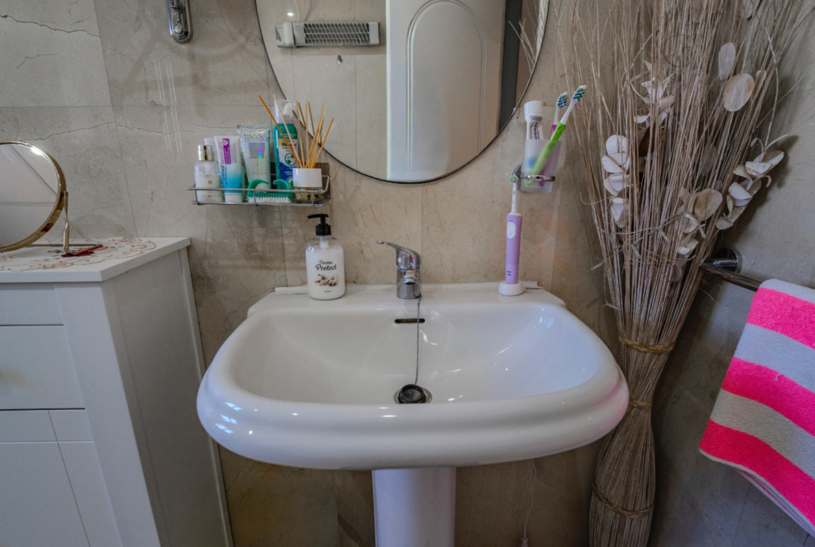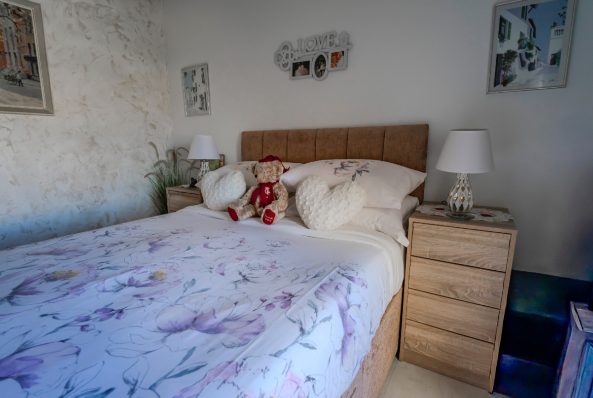 Dom pierwotnie posiadał trzy sypialnie, z czego jedna została przekształcona w elegancką jadalnię – z łatwą możliwością przywrócenia jej pierwotnej funkcji. W obecnym układzie nieruchomość oferuje 2 sypialnie, 1 łazienkę oraz dodatkową toaletę dla gości. Przestronny i jasny salon z dużą ilością naturalnego światła wyposażony jest w kominek na pellet, który zapewnia komfort również w chłodniejszych miesiącach. Z salonu prowadzi wyjście na południowy taras z widokiem na basen i zadbane ogrody wspólnoty, który dzięki szklanym zasłonom może pełnić funkcję całorocznej oranżerii.